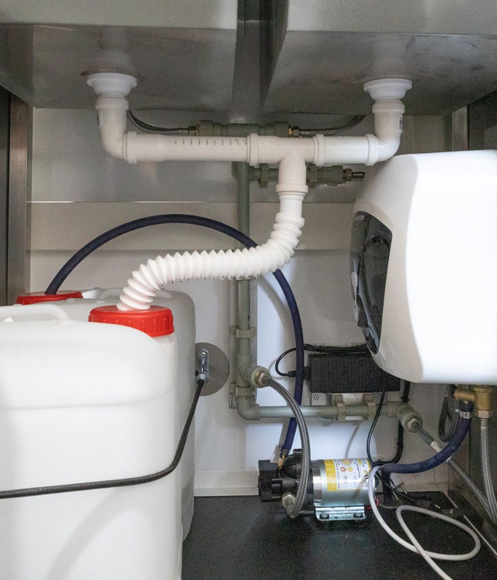 - Sanitary module (double sink, 1 faucet, 2 water tanks, boiler, containers for soap and paper towels)